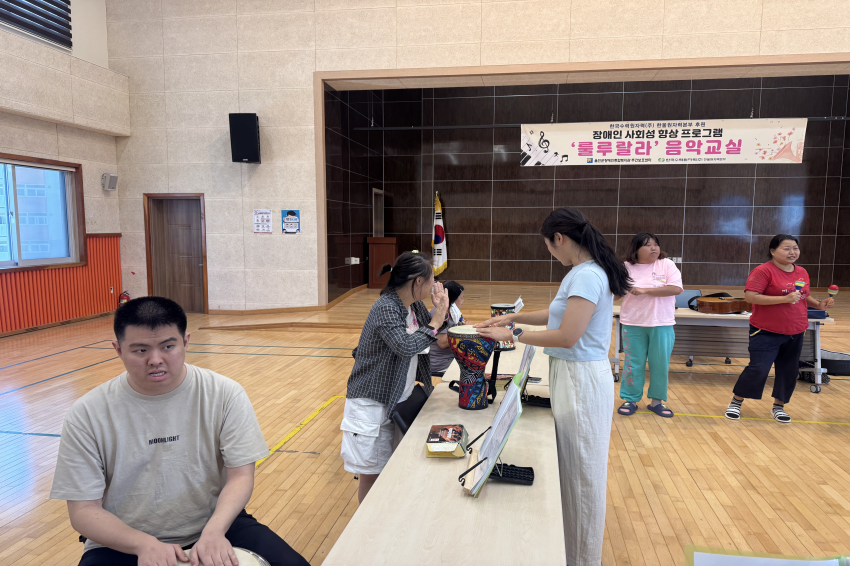 [주간보호센터]- 08월 '룰루랄라'음악교실 울진군장애인종합복지관주간보호… 0 172 09.01 09:34 한국수력원자력(주) 한울원자력본부의 후원을 받아 2025년 장애인 사회성 향상 프로그램 지원사업으로 '음악교실 서자연 강사'와 08월 '룰루랄라' 음악교실을 진행하였습니다. 오카리나, 젬베, 마라카스, 공명실리폰 등을 포함하여 1:1 레슨도 받고 다른 이용자들과 모여 여러 악기로 합주하며 즐겁게 참여하고 계십니다.