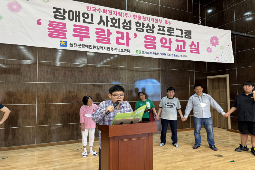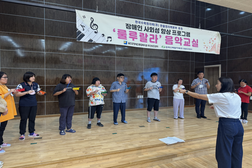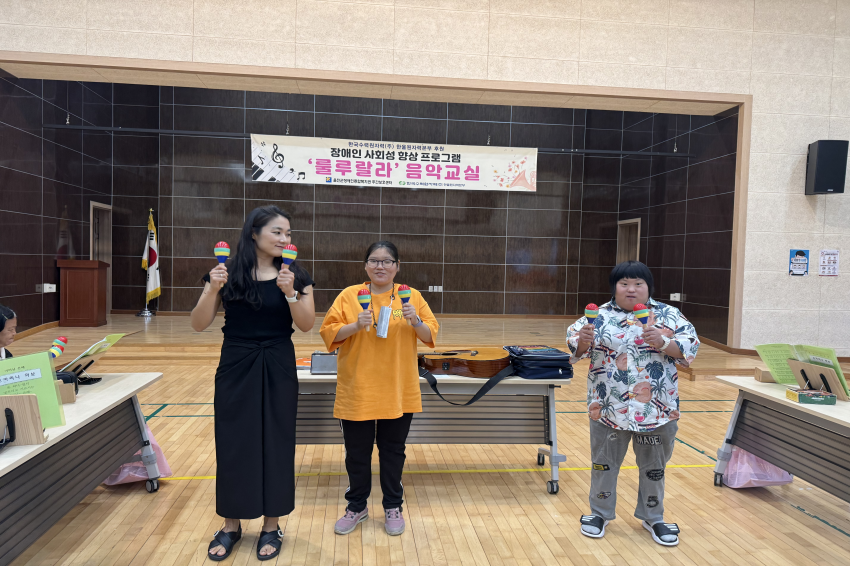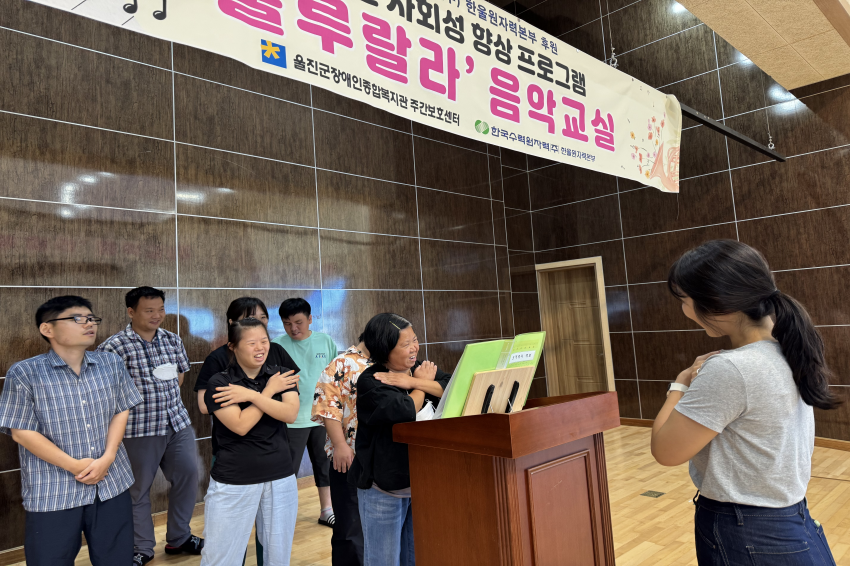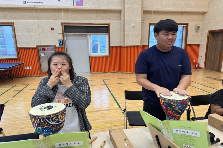 [주간보호센터]- 09월 '룰루랄라'음악교실 울진군장애인종합복지관주간보호… 0 15 10.13 09:28 한국수력원자력(주) 한울원자력본부의 후원을 받아 2025년 장애인 사회성 향상 프로그램 지원사업으로 '음악교실 서자연 강사'와 09월 '룰루랄라' 음악교실을 진행하였습니다. 오카리나, 젬베, 마라카스, 공명실리폰 등을 포함하여 1:1 레슨도 받고 다른 이용자들과 모여 여러 악기로 합주하며 즐겁게 참여하고 계십니다.