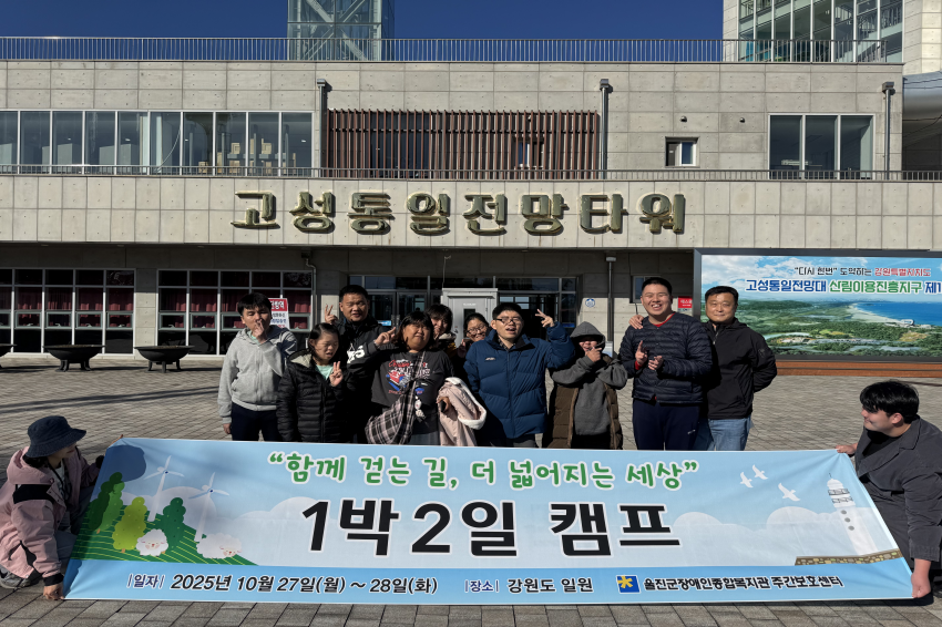 주간보호센터] - 캠프 (속초&고성일대) 울진군장애인종합복지관주간보호… 0 13 12시간전 1박 2일 캠프로 속초와 고성일대를 다녀왔습니다! 가을 정취가 물씬 느껴지는 날씨 속에 통일전망대, 김일성별장, 설악산 등을 방문하며 즐거운 추억을 쌓았습니다. 망원경으로 북한 초소를 관찰하고, 케이블카를 타며 단풍이 물든 설악산 전경을 감상하는 등 다양한 체험활동을 즐겼습니다. 모두가 웃음 가득한 캠프를 보내며 서로를 격려하고 협동심을 기를 수 있는 소중한 시간이었습니다