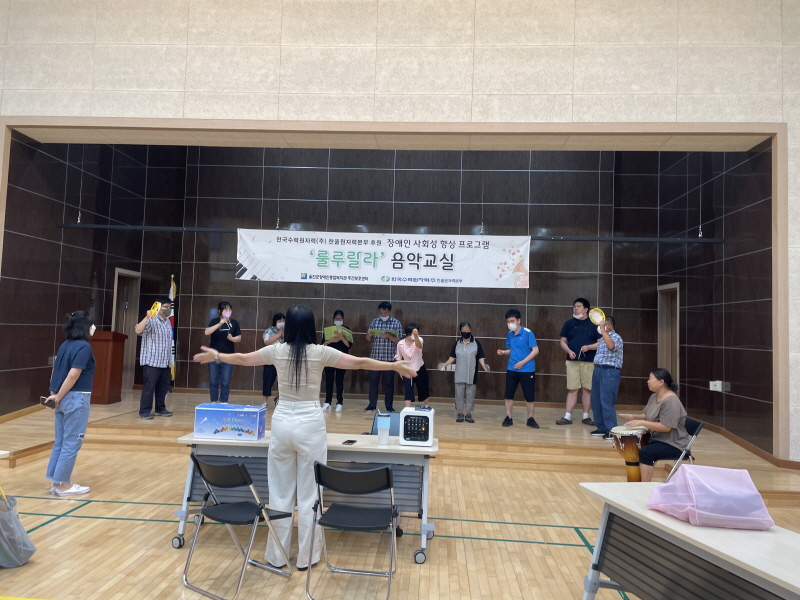 [주간보호센터]-08월'룰루랄라'음악교실 울진군장애인종합복지관주간보호… 0 1544 2023.08.31 15:15 한국수력원자력(주) 한울원자력본부의 후원을 받아 장애인 사회성 향상 프로그램 지원사업으로 '음악교실 김영주 강사'와 08월 '룰루랄라' 음악교실을 진행하였습니다. 1:1레슨도 받고 기존에 연주하던 악기(오카리나, 칼림바)를 포함한 마라카스와 핸드벨 등 다른 이용자들과 모여 여러 악기로 연주하며 즐겁게 참여하고 계십니다.