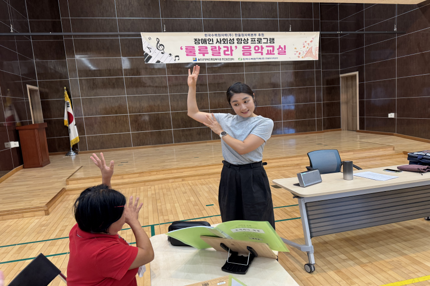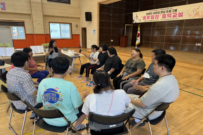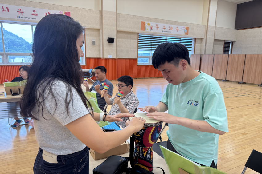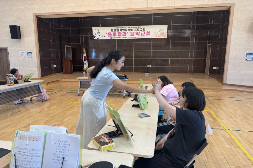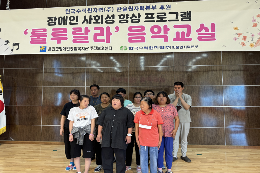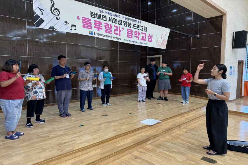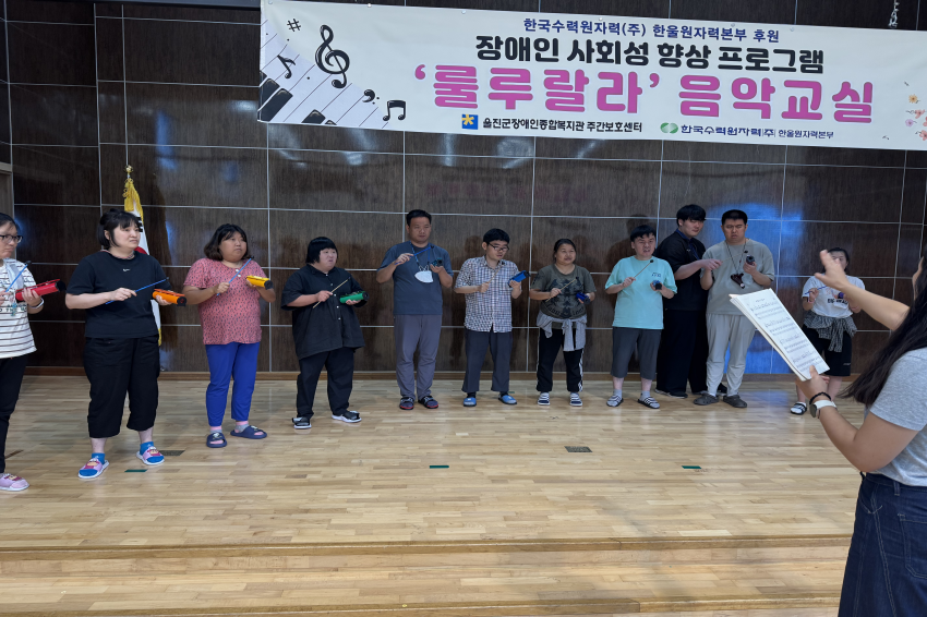 [주간보호센터]- 08월 '룰루랄라'음악교실 울진군장애인종합복지관주간보호… 0 308 09.01 09:34 한국수력원자력(주) 한울원자력본부의 후원을 받아 2025년 장애인 사회성 향상 프로그램 지원사업으로 '음악교실 서자연 강사'와 08월 '룰루랄라' 음악교실을 진행하였습니다. 오카리나, 젬베, 마라카스, 공명실리폰 등을 포함하여 1:1 레슨도 받고 다른 이용자들과 모여 여러 악기로 합주하며 즐겁게 참여하고 계십니다.