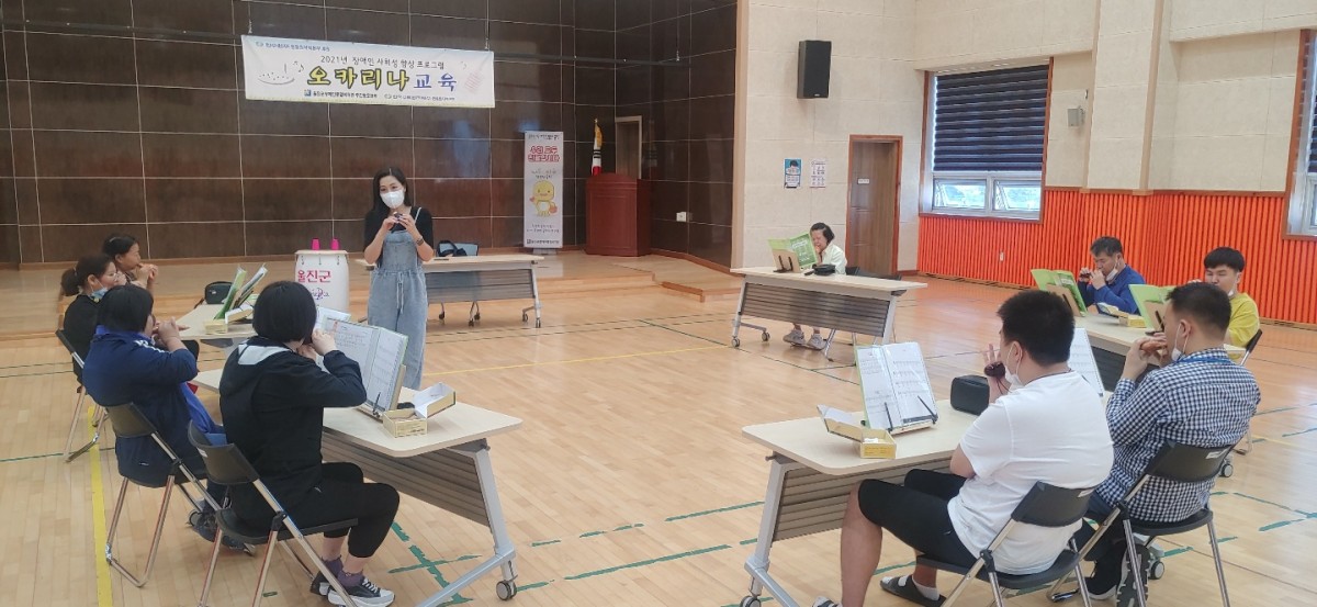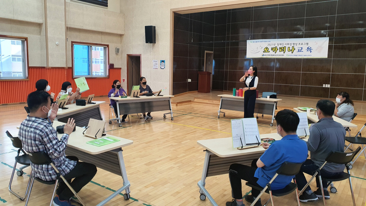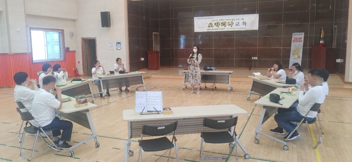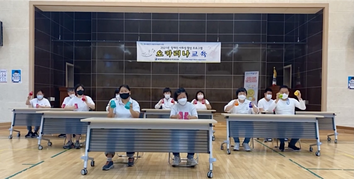 [주간보호센터] - 09월 오카리나 교육 윤혜리 0 1910 2021.10.28 15:11 한국수력원자력(주) 한울원자력본부 후원으로 2021년 장애인 사회성 향상 프로그램 지원사업으로 '어울림오카리나 앙상블 김영주 강사'와 09월 오카리나 교육을 진행하였습니다. 본 교육은 오카리나 교육 뿐만 아니라 컵타와 각종 음악교육을 병행하여 진행하고 있습니다.* 본 센터에서는 코로나 바이러스 예방 및 확산 방지와 관련하여 일 3회 발열체크, 매 시간 센터 소독, 마스크 필수 착용, 프로그램 및 중식 전후 손소독, 이용자 및 직원 간 거리두기로 프로그램을 진행하고 있습니다.