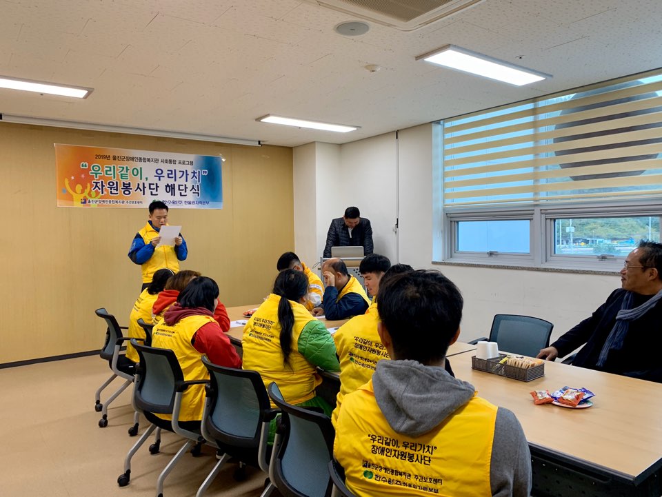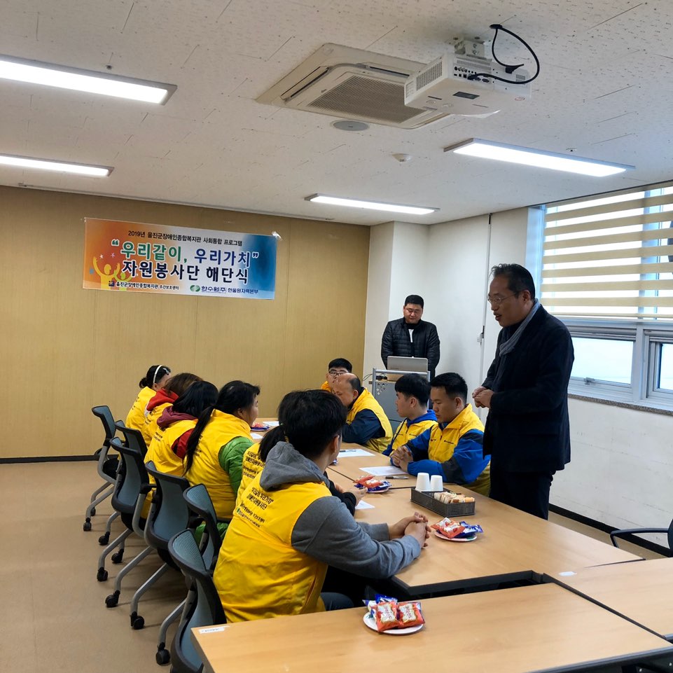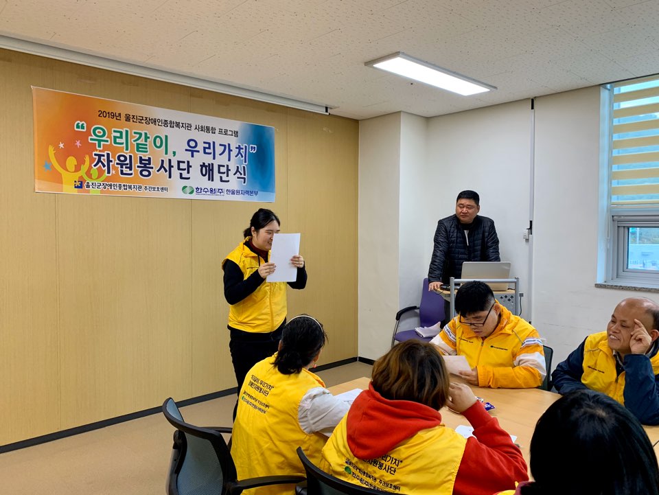 11월 13일 수요일, 한국수력원자력(주) 한울원자력본부 사업자지원사업으로 선정되어 사회통합 프로그램의 일환으로 결성된 "우리같이, 우리가치" 자원봉사단이 총 19회의 자원봉사를 마지막으로 해단식을 실시하였습니다.